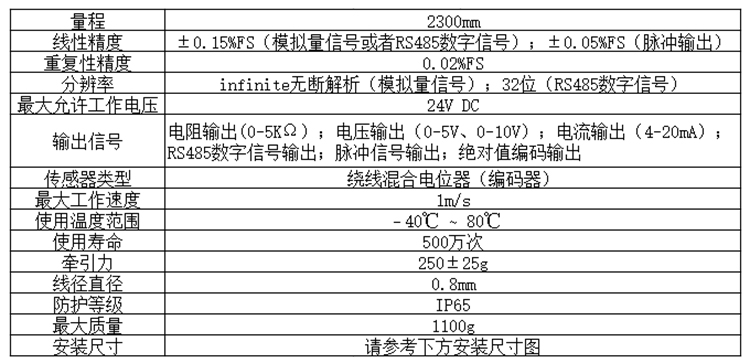 3、拉绳位移传感器拉绳材质为不锈钢丝绳,请注意加以防护,避免外力磨损、划伤,导致传感器运转不顺畅。